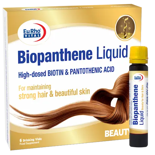 ویال خوراکی بیوپانتن لیکوئید یوروویتال یک مکمل قدرتمند و تخصصی است که با دارا بودن مقادیر بالای بیوتین و پانتوتنیک اسید (ویتامین B5)، نقش مهمی در بهبود سلامت مو، پیشگیری از ریزش مو و تقویت پوست و ناخنها دارد. این محصول با فرمولاسیون مایع و قابلیت جذب سریع، جایگزینی مناسب برای قرص و کپسول بوده و مصرف آن بسیار آسان است.