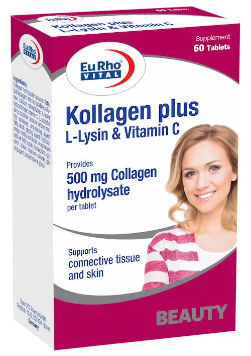 قرص کلاژن پلاس یوروویتال حاوی کلاژن بههمراه آمینو اسید لیزین و ویتامین C است که با تحریک کلاژن سازی و افزایش آبرسانی باعث بهبود سلامت و شادابی پوست، مو و ناخنها میشود.